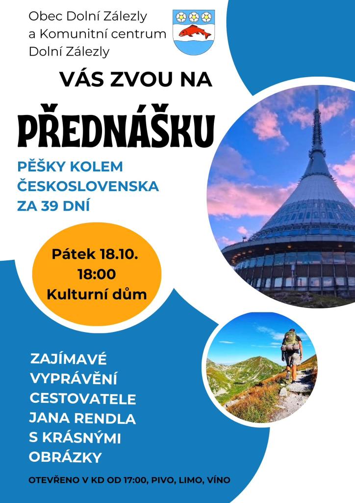 Zveme vás na zajímavé povídání cestovatele Jana Rendla o jeho cestě pěšky kolem Československa za 39 dní. Dveře Kulturního domu budou otevřeny pro všechny od 17:00 hod.