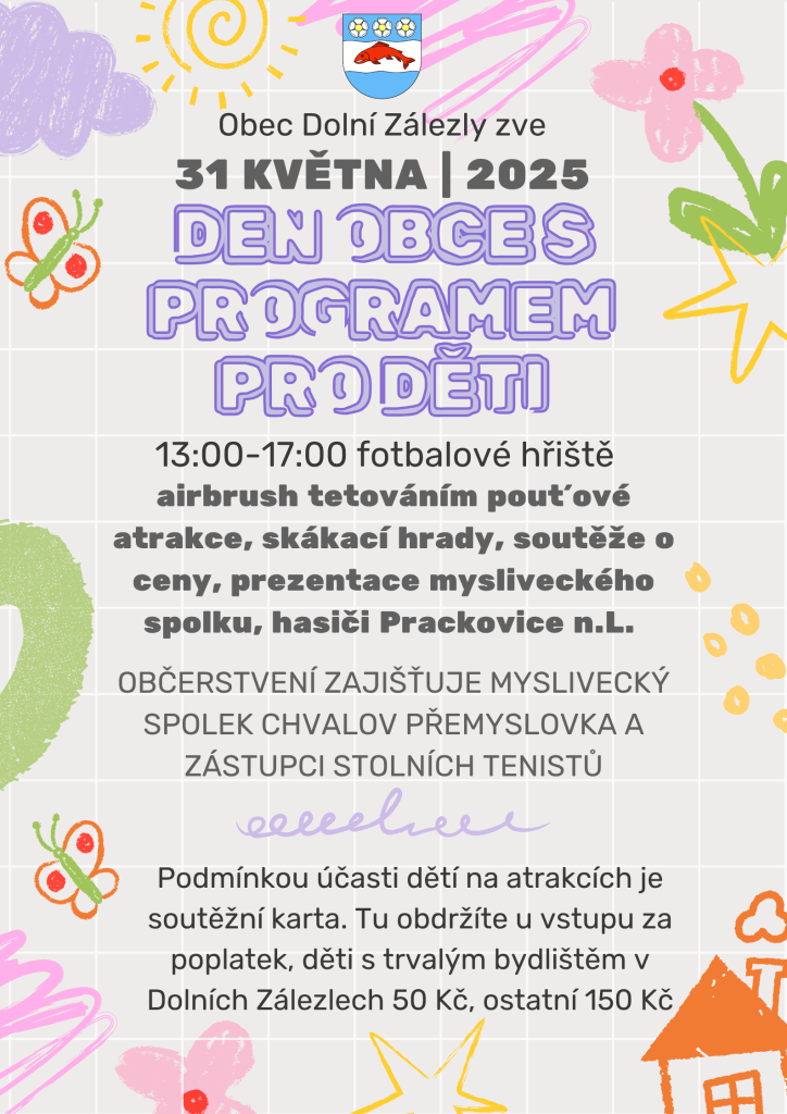 Obec Dolní Zálezly pořádá Den obce, který se koná 31. května 2025 od 13:00 do 17:00 na fotbalovém hřišti. Čekají vás pouťové atrakce, skákací hrady, soutěže o ceny a prezentace mysliveckého spolku, hasičská pěna. Pro účast dětí na atrakcích je nutná soutěžní karta, kterou můžete získat u vstupu za poplatek, přičemž pro děti s trvalým bydlištěm v Dolních Zálezlech je cena 50 Kč, pro ostatní 150 Kč.