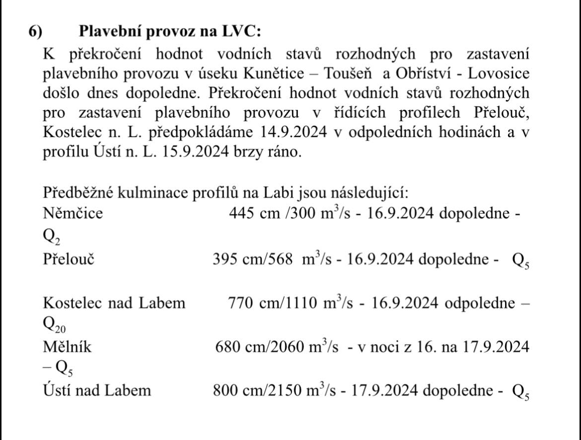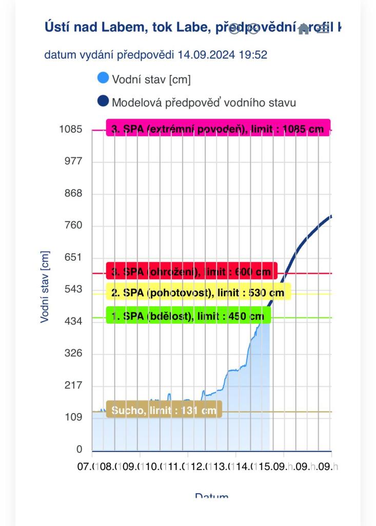 podle poslední zprávy Povodí Labe o mimořádných vodních stavech a povodňové situaci dosáhlo Labe v Ústí nad Labem v 18 hodin 479 cm. Labe stále stoupá. Kulminace se předpokládá 17.9. dopoledne na cca 800 cm.