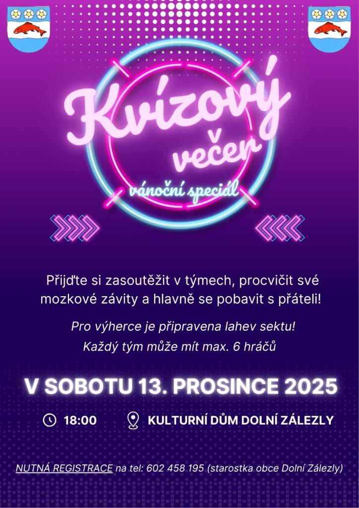 Obec Dolní Zálezly srdečně zve všechny milovníky zábavy, vědomostí a přátelské soutěže na Kvízový večer – vánoční speciál, který se uskuteční v sobotu 13. prosince 2025 od 18:00 v Kulturním domě Dolní Zálezly.