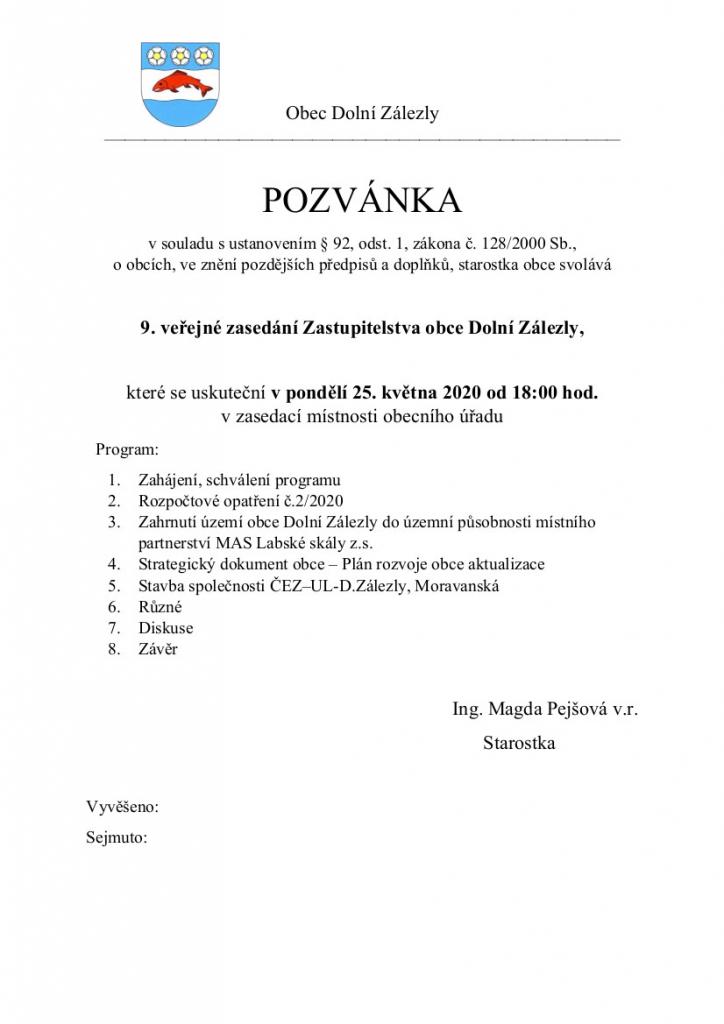9. veřejné zasedání se uskuteční v pondělí 25. května 2020 od 18:00 hod. v zasedací místnosti obecního úřadu.