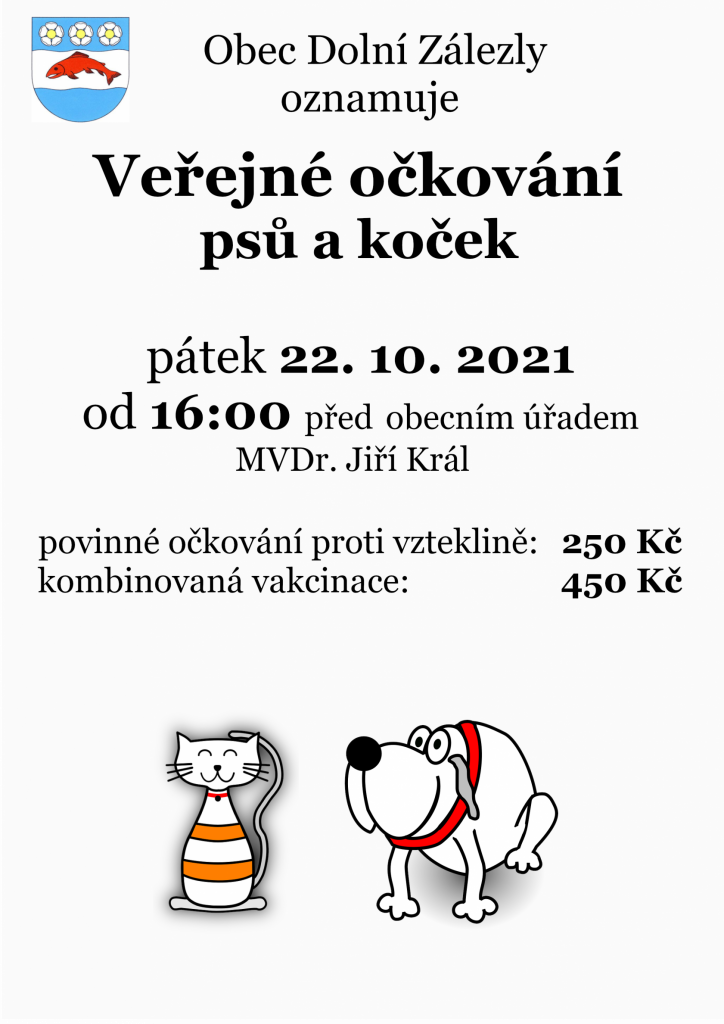 Veřejné očkování psů a koček se uskuteční 22.10.2021 od 16:00 před obecním úřadem.